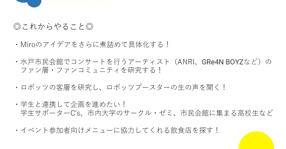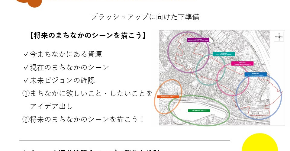 〈連携企画づくり〉〈パークレット製作〉〈未来ビジョンのブラッシュアップ〉の3つの部会に分かれ、オンライン参加者も交えて自由に議論しました。
