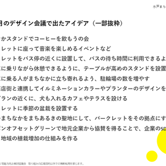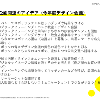 まちなかの再生に向けたアイデア出しを踏まえ、秋に予定する水戸まちなかリビング作戦の具体的な内容の検討を行いました。