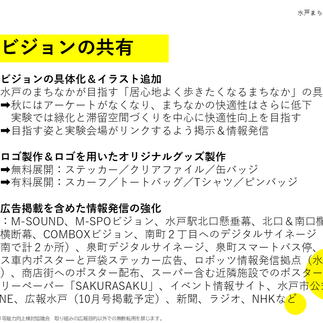 まちなかの再生に向けたアイデア出しを踏まえて、秋に予定する試行・実証実験「水戸まちなかリビング作戦2025」の実験案を固めるとともに、活動のロゴデザイン案について議論しました。