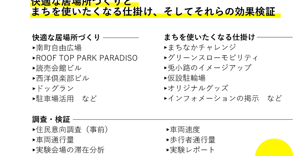 社会実験の快適な居場所づくりとまちを使いたくなる仕掛け、それらの効果検証について昨年度の取り組みを振り返りながら各空間・仕掛けづくりごとに案を紹介しイメージを共有しました。